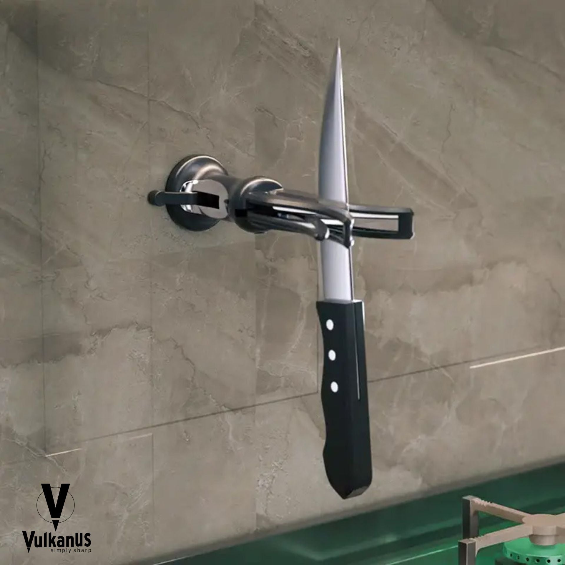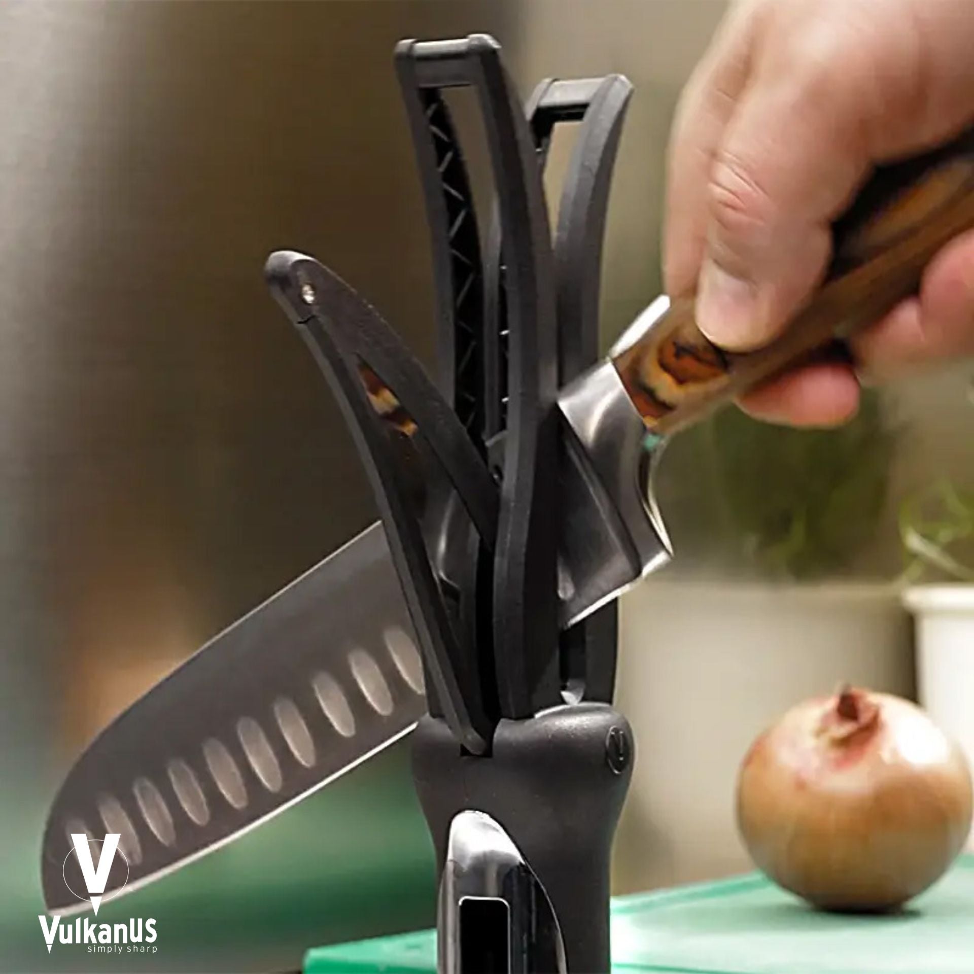 Der Vulkanus Crown ist nicht nur optisch ein Juwel. Ein Messerschärfer, welcher sogar japanische Messer schärfen kann. Seine intelligente Bauweise ermöglicht eine schnelle und flexible Befestigung sowohl vertikal an der Wand, als auch horizontal am Tisch. Der Crown ist geeignet für den Gebrauch im klassischen Haushalt, als auch in Großküchen und Fleischerei Betrieben, denn sein Messerschärfsystem schärft Klingenarten von glatter Schneide, über Wellenschliff bis zur Mikroverzahnung. Qualität Originalprodukte von Vulkanus haben eine sehr hohe Qualität in der Fertigung und Verarbeitung der Materialien. Dadurch erreichen alle Messerschärfer eine sehr hohe Lebensdauer. Dafür bürgt das Unternehmen VulkanUS. Achten Sie auf das Original. Flexibilität Ob am Tisch, an der Wand oder mobil in der Hand, der Vulkanus Crown hebt sich durch seine Flexibilität klar von anderen Messerschärfern ab. Problemloses Schärfen ohne jegliche Kratzer auf der Klingenoberfläche. Befestigung Der Vulkanus Crown kann mit seinem durchdachten Saugnapfsystem sowohl horizontal am Tisch, als auch vertikal an einer Wand stabil befestigt werden. Geeignete Oberfläche vorausgesetzt. Äußerst hochwertig und sehr robust Komplett aus hochwertigem und stabilem Kunststoff Schärfen und Abziehen in einem Gerät Macht glatte Klingen und Wellenschliff superscharf Schärft auch Klingen mit Mikroverzahnung Einfachste Bedienung für jeden Flexible Befestigung durch Saugnapfsystem Schärfwinkel: 11° – 21° Keine Kratzer auf der Klingenoberfläche Passt sich an den Schneidewinkel an Schärft ohne Wärmeeinwirkung Maße: Höhe 26 cm x 8 cm Spülmaschinenfest Trocknen mit Küchentuch Geeignet für Messer mit glatter Schneide Geeignet für Messer mit Wellenschliff